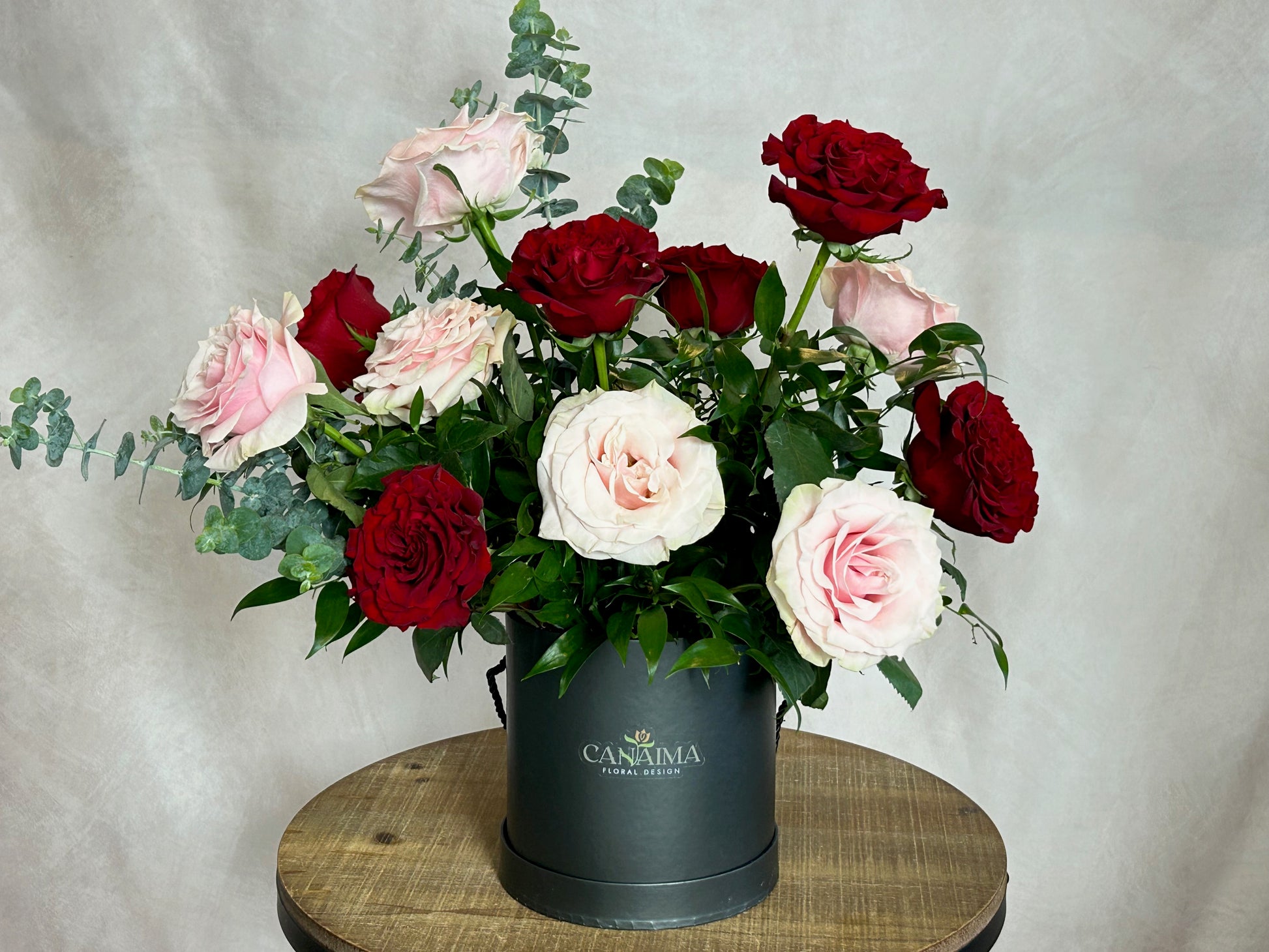 Soft like velvet, romantic like roses. The perfect flowers for Valentine's day. Red heart roses, pink roses designed in a round box.
