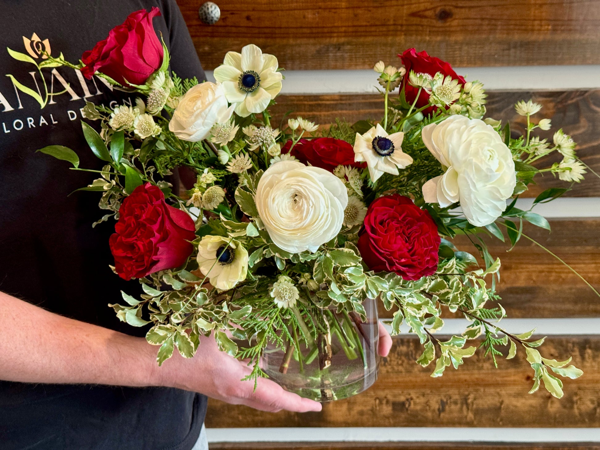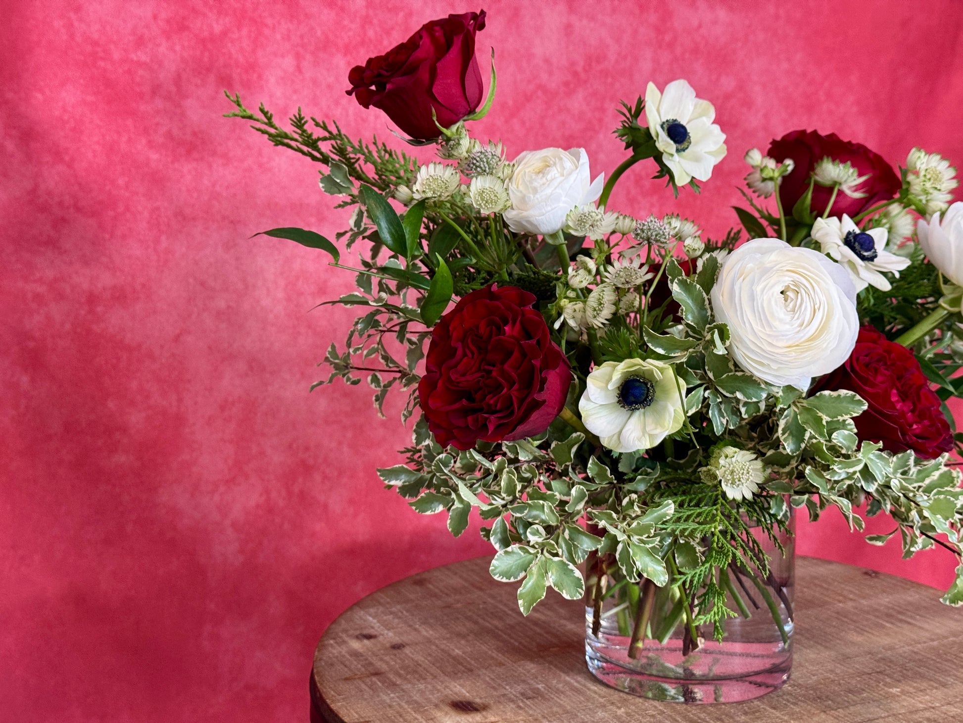 This beautiful arrangement is inspired by the delicious peppermint candy. Design in a clear glass vase, heart red rose, ranunculus, white anemones and white flowers.