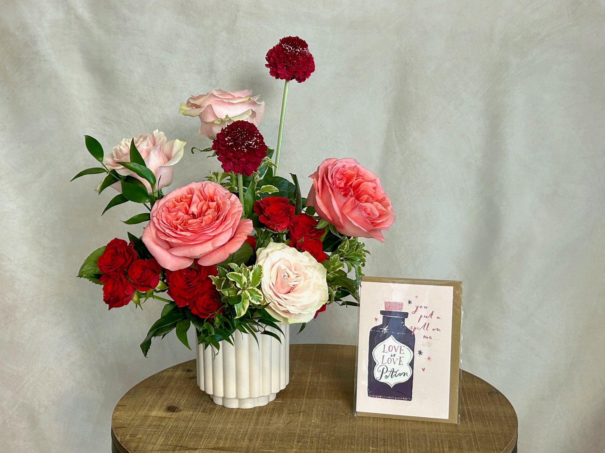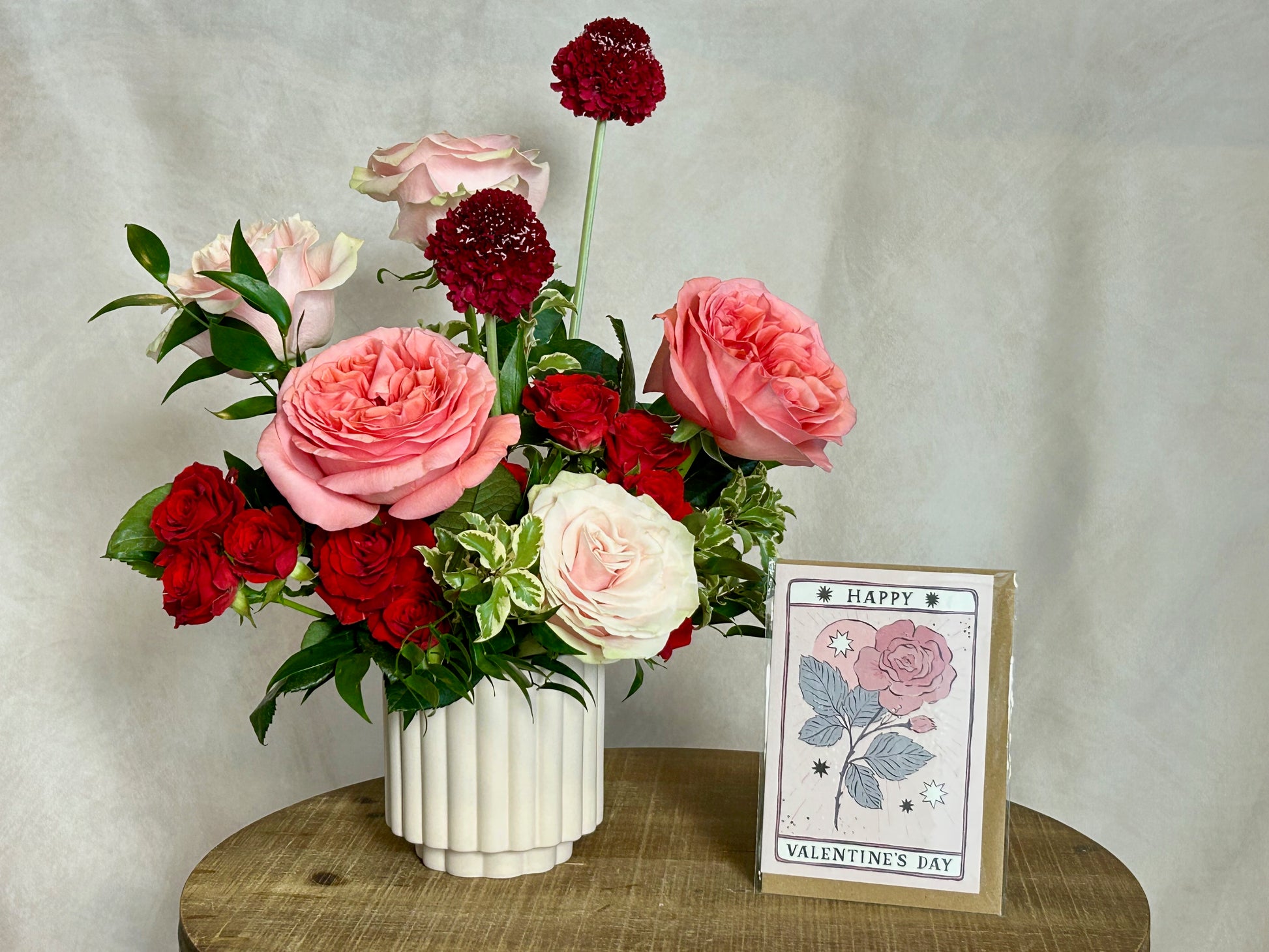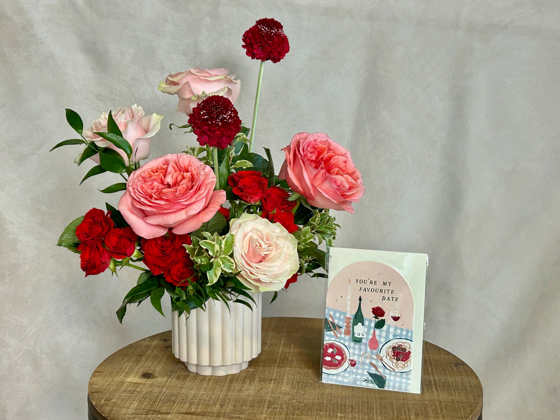 Sweet and sophisticated flower arrangement, pink garden roses with red blooms perfect to fall in love! Red spray roses, red scabiosas, garden roses in a light pink ceramic vase.