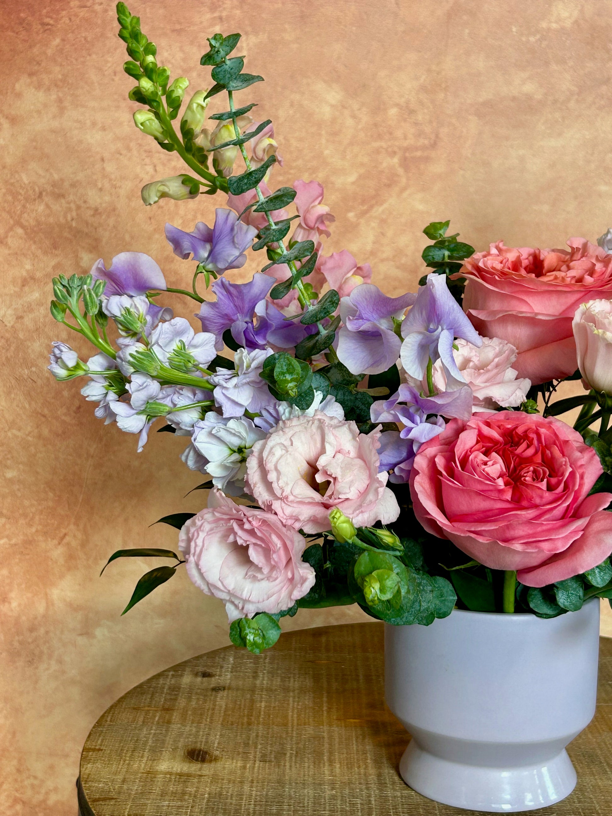 JE T'AIME my sweet amour! a soft color palette, elegant and romantic perfect to say i love you. Garden roses, sweet peas, snap dragon, design in a lavender ceramic vase.